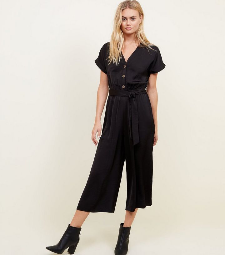 Schwarzer Jumpsuit Aus Satin Mit Verkurzter Lange Und Knopfleiste Vorne New Look