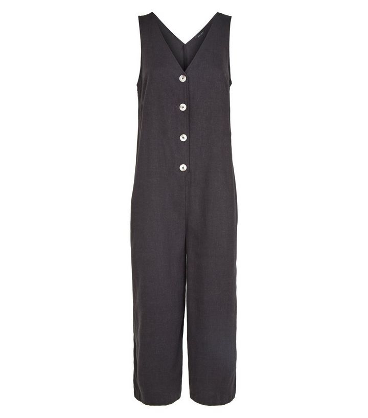 Schwarzer Jumpsuit In Leinen Optik Mit Knopfleiste Und Verkurzter Lange New Look