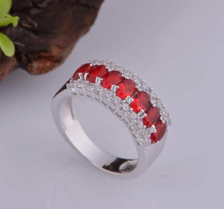 Rubin Und Diamant Ring Fuer Dame In 18kt Weissgold Mit 7 Steinen In Krappenfassung