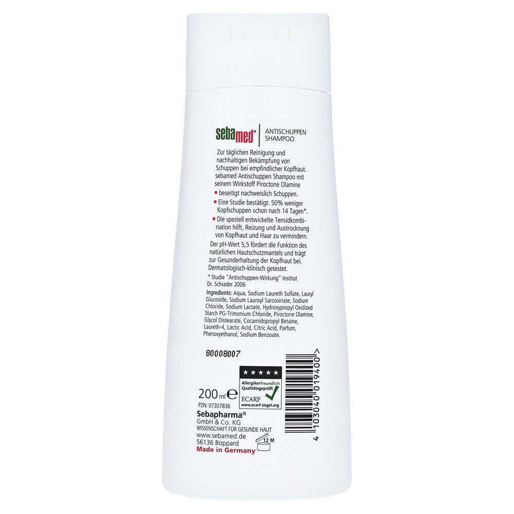The ingredients of Sebapharma Sebamed AntischuppenShampoo are listed in alphabetical order now For members they are listed in the same order as given by the manufacturer of this cosmetic product Click on an ingredient to see its details 1 Aqua (Water) 2 Cocoamidopropyl Betaine 3. Das Sebamed Anti Schuppen Shampoo ist ein bekanntes Produkt, das mit seiner Wirkungsweise überzeugend ist Im Vergleich mit anderen Schuppenshampoos ist die Wirkung bestätigt und du bekommst erste Ergebnisse nach 12 Anwendungen Preis prüfen (*) Platz 11 Biotique Anti Schuppen Shampoo. 1 Eigenschaften Das AntiSchuppenShampoo aus dem Hause SANTE Naturkosmetik ist Natruezertifiziert, da es u a ohne Tierversuche und in Deutschland produziert wird Es reinigt Kopfhaut und Haar sanft und ist speziell entwickelt für schuppige Kopfhaut und fettige HaarDurch Inhaltsstoffe wie BioWacholderöl, BioBirkenblatt oder WeidenrindenExtrakt, die das Gleichgewicht der Kopfhaut.