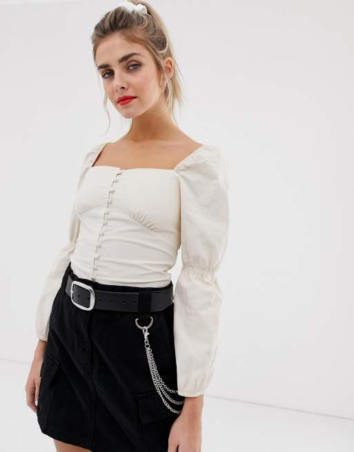 Bershka Modische Bluse Mit Eckigem Ausschnitt Und Knopfleiste In Beige Asos