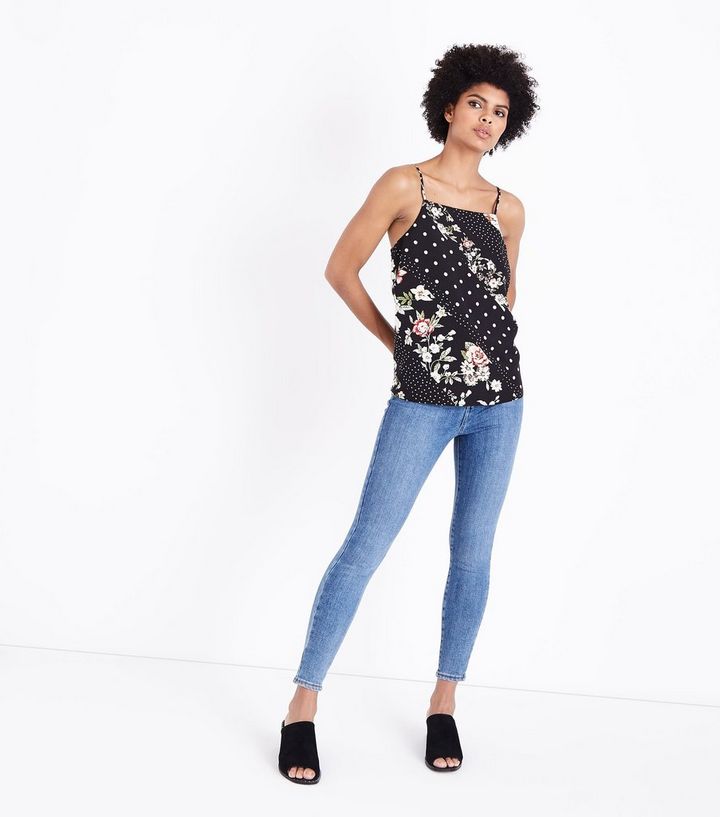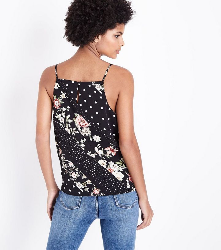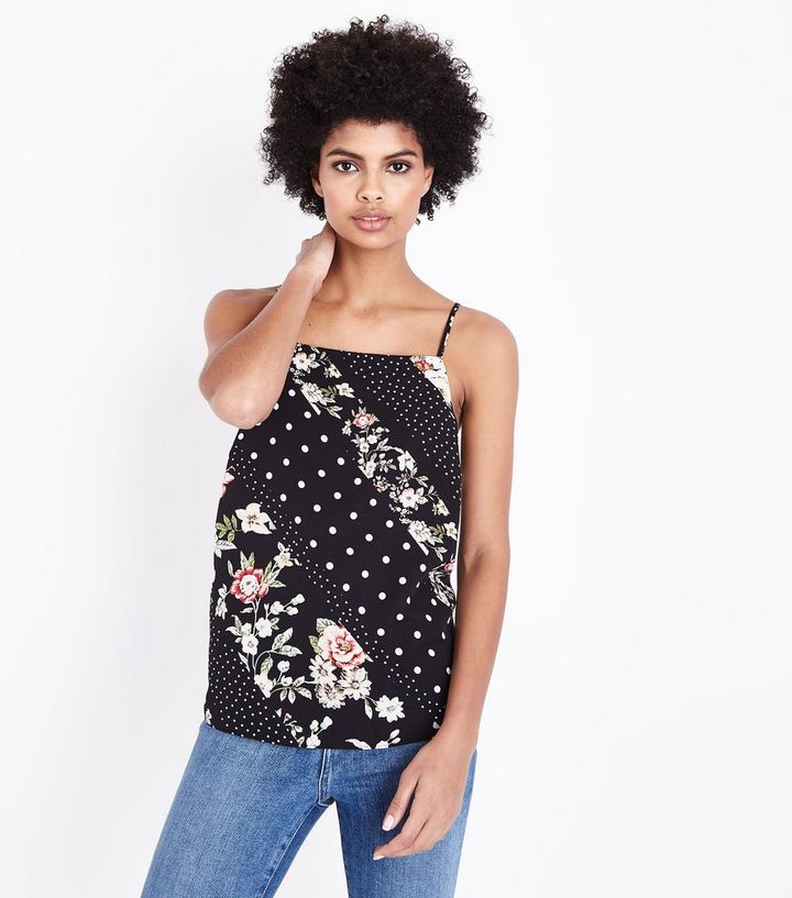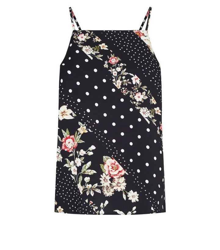 Schwarzes Tragertop Mit Blumen Und Punktmuster Und Viereckigem Ausschnitt New Look