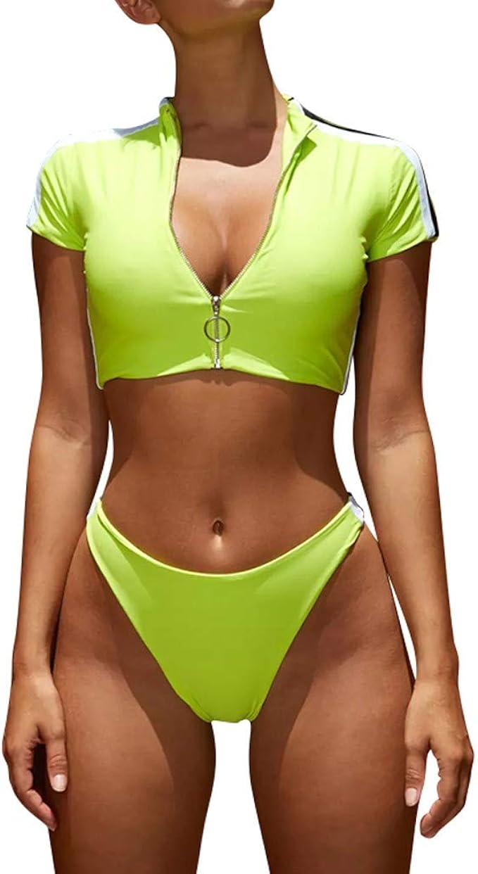 Dream Room Damen Bikini Set Sportlich Mit Reissverschluss Vorne Zweiteiliger Badeanzug Push Up Gepolsterte Bade Badeanzug Beachwear Bikini Sport Kurzen Armeln Oberteil Badeanzuge Amazon De Bekleidung