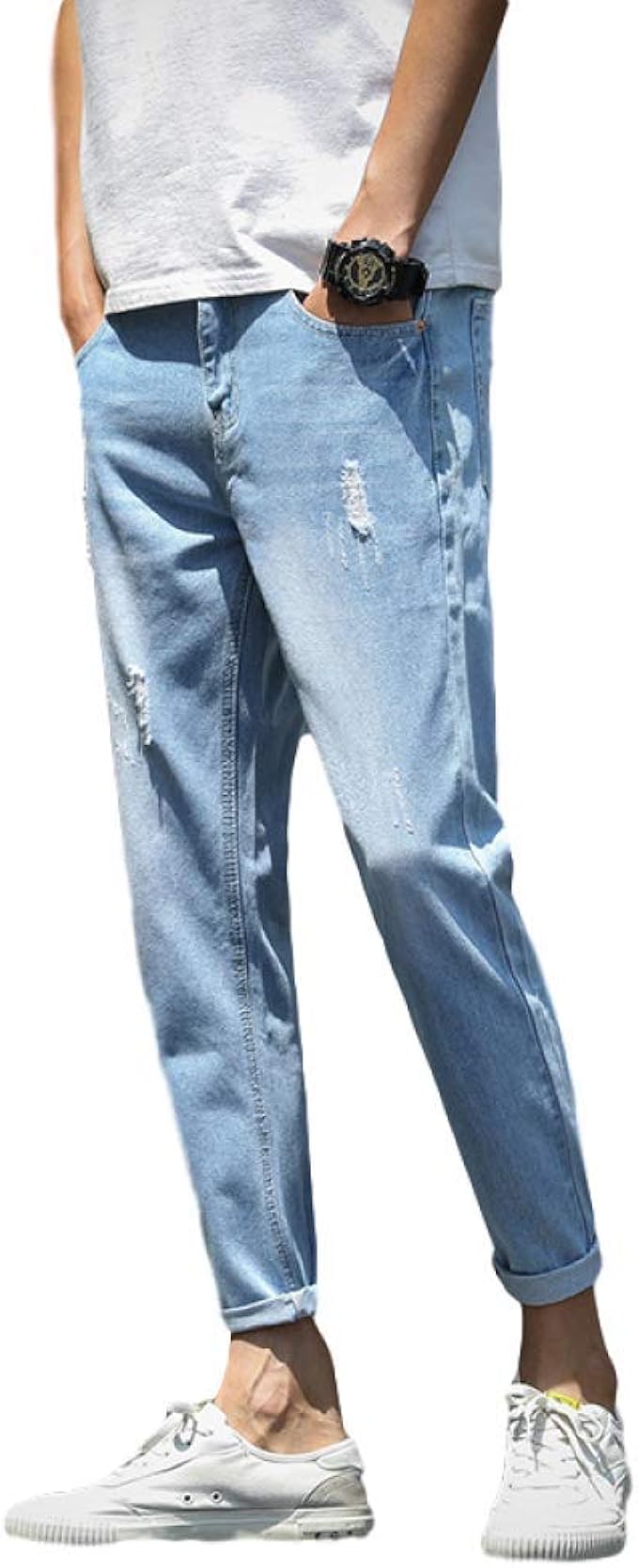 Herren Ripped Holes Tapered Jeans Stretch Slim Fit Mittelhohe Fashion Cuffed Denim Knochellange Hose Alle Taillengrossen Amazon De Bekleidung