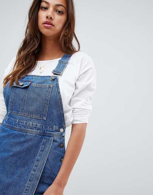 Asos Design Midi Latzkleid Aus Denim In Verwaschenem Mittelblau Asos