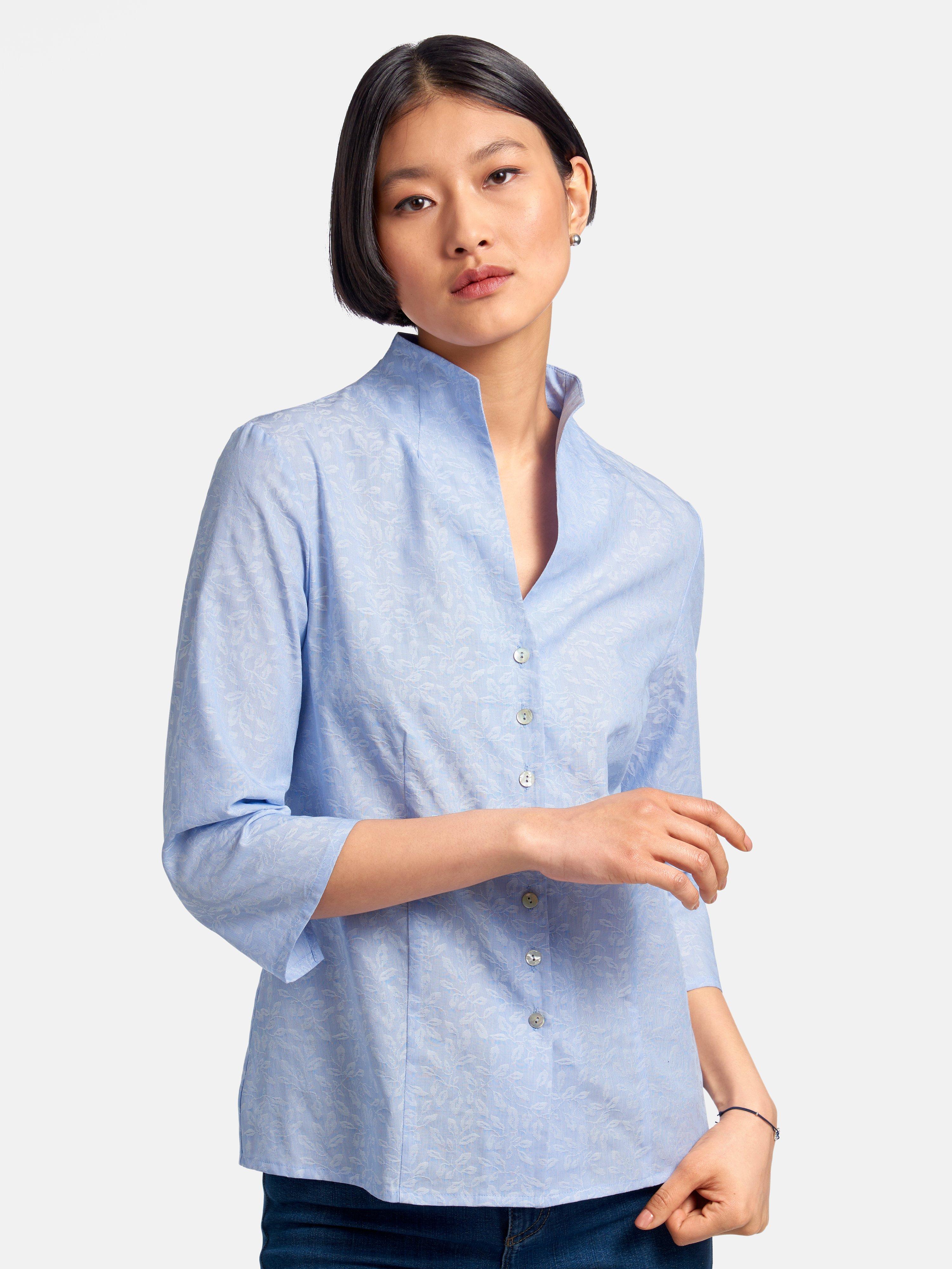 Bluse von PETER HAHN mit Kelchkragen und einem kleinen Schlitz am 3/4Arm Bestens zu kombinieren und angenehm zu tragen in reiner Naturqualität mit dezenten Webstreifen 100% Baumwolle, zertifiziert nach Standard 100 by OEKOTEX®. Bluse Kelchkragen Im Frankonia Mode Online Shop können Damen schöne Blusen mit Kelchkragen kaufen und auf Rechnung bestellen Hier finden Damen elegante Kelchkragenblusen in Langarm, Ohne Ärmel und Kurzarm in den Farben Blau, Weiß, Rosa und Schwarz. Bluse von PETER HAHN mit Kelchkragen und einem kleinen Schlitz am 3/4Arm Feminin und besonders hochwertig aus aufwendig gewebtem Jacquard mit feinen BlattMotiven Leicht taillierter Schnitt mit edlen Perlmuttknöpfen und leicht gerundetem Saum 100% Baumwolle, zertifiziert nach Standard 100 by OEKOTEX®.