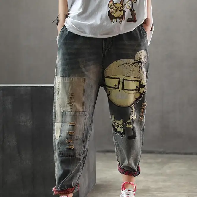 21 Women Spring Autumn Fashion Baggy Jeans Vintage Cartoon Doglittle Denim Jeans Mid Female Casual Frayed Harem Pants From Guchen3 27 Dhgate Com