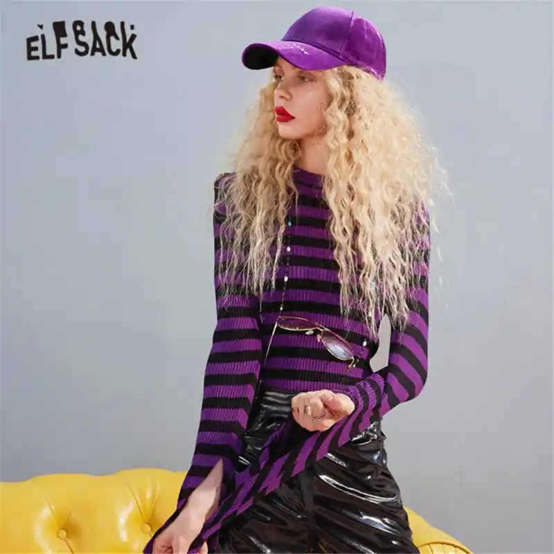 Elfsack Lila Gestreifte Gestrickte Casual Pullover Frauen Pullover Herbst Elf Orange Vintage Koreanische Damen Grundlegende lichen Schlank Top Pullover Aliexpress