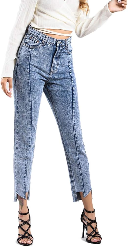 Suncaya Damen Hohe Taillen Jeans Unelastische Gerade Schnee Blaue Hosen Beilaufige Weiche Unregelmassige Hose Fruhlingsherbst Amazon De Bekleidung