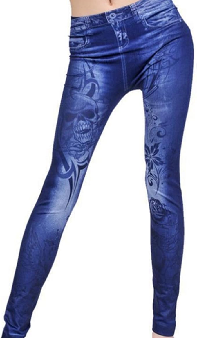 Incendemme Damen Madchen Weiche Jeans Look Destroyed Look Gedruckte Leggings Hipster Dunne Stretch Leggins Hose Pants Mit Blumen Und Schadel Blau Amazon De Bekleidung