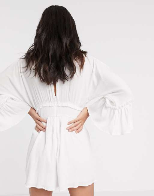 Asos Design Kurzer Ausgestellter Jumpsuit In Knitter Optik Mit Ruschenarmeln In Weiss Asos