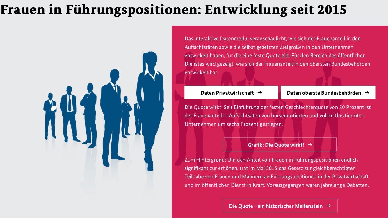 DJ Kabinett stimmt verbindlicher Frauenquote in Vorständen zu Von Andrea Thomas BERLIN (Dow Jones)Das Bundeskabinett hat die Einführung einer Frauenquote in Vorständen von börsennotierten. Bundestag beschließt Gesetz zur Frauenquote in Aufsichtsräten Der Deutsche Bundestag hat am das Gesetz für die gleichberechtigte Teilhabe von Frauen und Männern an Führungspositionen in der Privatwirtschaft und im öffentlichen Dienst beschlossen. Von Hadmut Danisch „Das RheinischWestfälische Institut für Wirtschaftsforschung hat einen Beitrag zur Serie Unstatistik des Monats der TU Dortmund, in dem es um die politischen Behauptungen zur Frauenquote in DAXVorständen, genauer gesagt den viel kürzeren Verweildauern von Frauen gegenüber Männern geht – was ja gerne als Vorwand genommen wird, um zu behaupten, dass Frauen da.