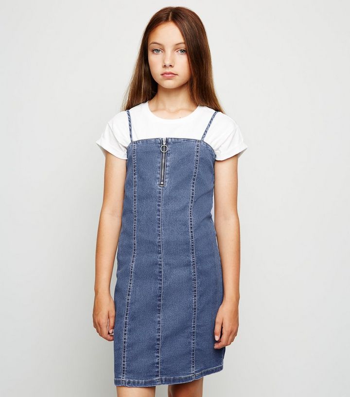 Girls Blaues Latzkleid Aus Jeansstoff Mit Halbem Reissverschluss New Look
