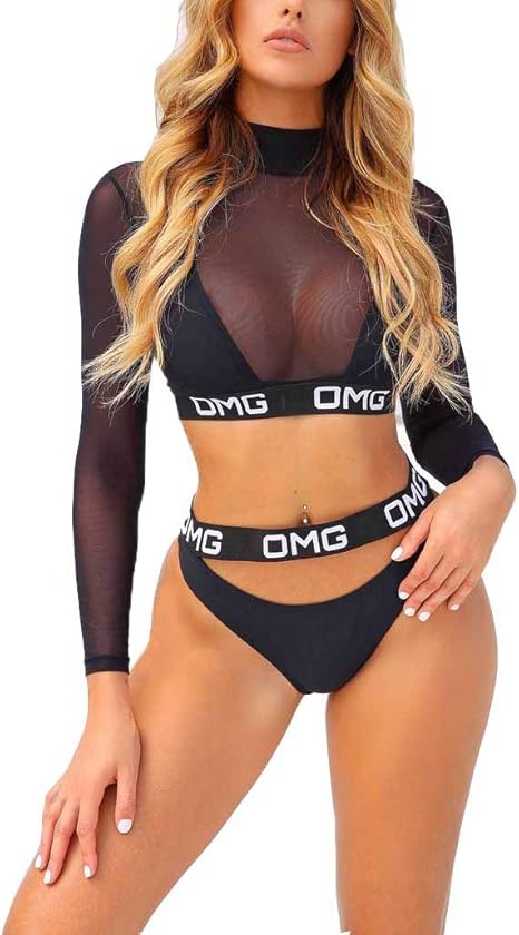 Aelle 3 Teiliger Frauen Badeanzug Mit Langen Armeln Bikini Set Netz Cover Up Tanga Bikini Mit Omg Print Badeanzug Badebekleidung Amazon De Bekleidung