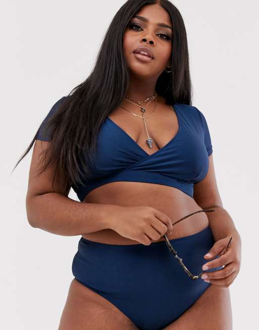 Peek Beau Curve Exklusives Bikinioberteil Mit Armeln In Schimmerndem Marineblau Asos