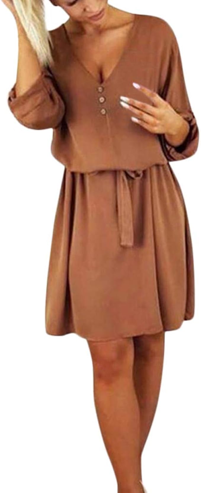 Goosuny Damen Kleid V Ausschnitt Langarm Sommerkleid Einfarbig Lose Buttons Blusenkleid Frauen Lassig Kurze Kleider Knielang Strandkleider Mit Gurtel Amazon De Bekleidung