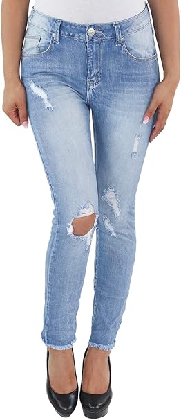 Damen Jeans Damen Stretch Rohren Huft Jeans Hose Mit Rissen Skinny Slim Fit Blau Omnia Ae