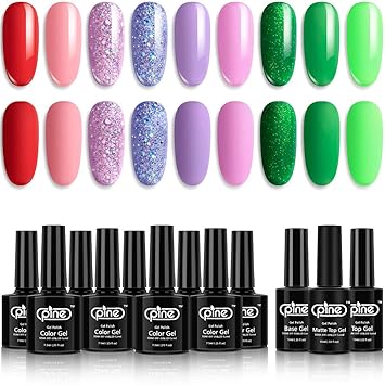 Amazon Com Pine Gel Nail Polish Set 9 Colors Green Purple Pink Glitter With Base No Wipe Glossy Top Matte Top Coat Soak Off Uv Led Gel 12 Pcs Beauty