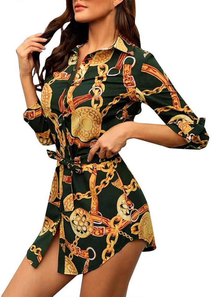 Auifor Frauen Lange Hulsen Ketten Druck Hemd Kleid Damen Beilaufiges Minikleid Amazon De Bekleidung