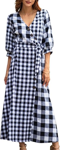 Vepodrau Damen Hemd Kleid Vintage Hals Zugeknopft Karierten Maxi Kleider Amazon De Bekleidung