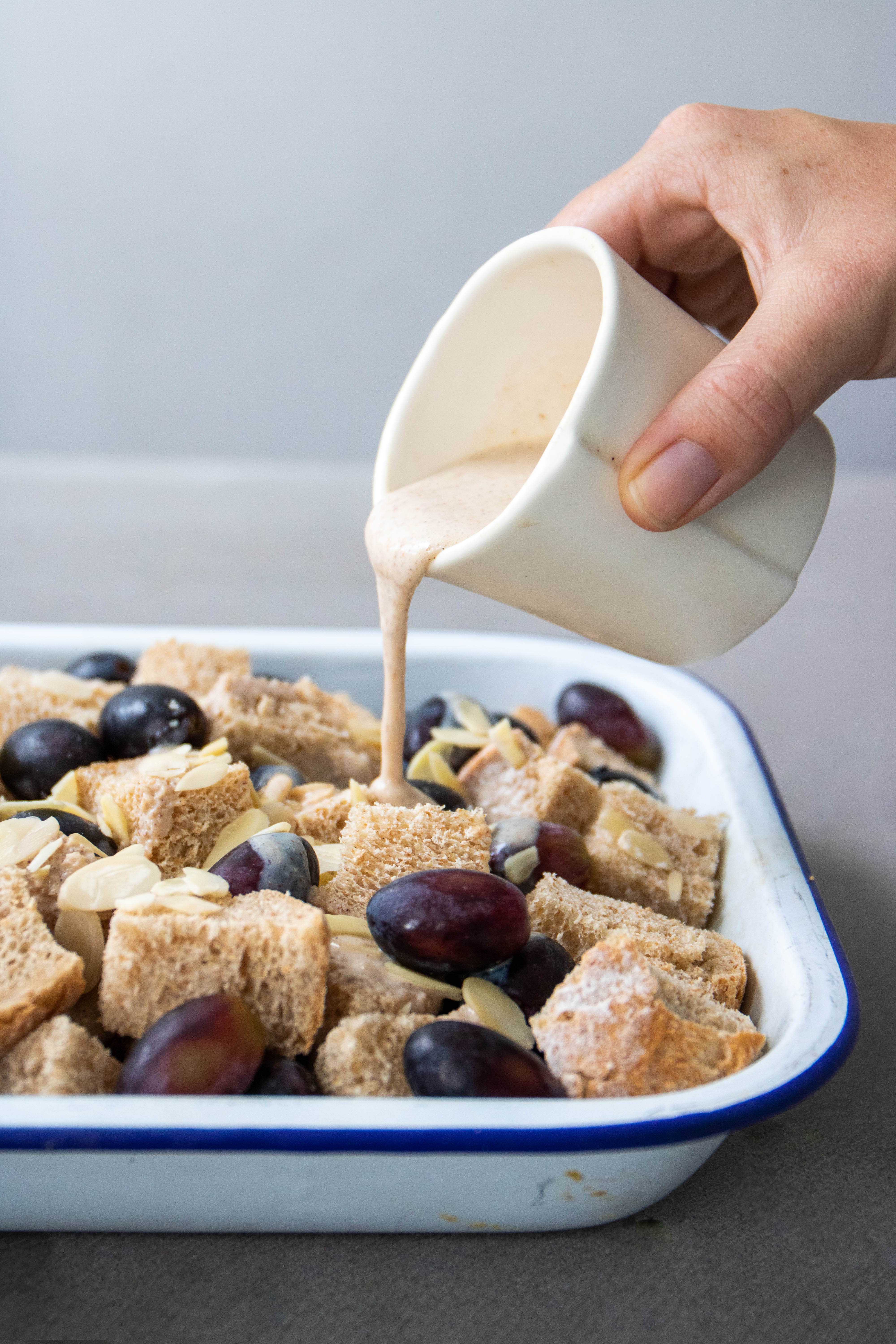 Ingredients 4 cups cubed dayold bread 3 cups soy milk 1 cup raisins ¾ cup white sugar ½ cup chopped almonds (Optional) 1 tablespoon vanilla extract 1 teaspoon ground cinnamon. Instructions Preheat the oven to 350ºF Have ready an 8 x 8inch nonstick or silicone baking pan In a large bowl, whisk together the pumpkin puree, plantbased milk, maple syrup, and vanilla. Preheat oven to 325 degrees Roughly tear vegan croissants or bread into large cubes and mix with one cup of frozen or fresh blueberries or fruit of your choice in an 8x8 baking dish In a blender, puree the flax seeds, sugar, half and half and salt and then pour over the fruit and bread mixture The flax seeds will add an eggy consistency!.