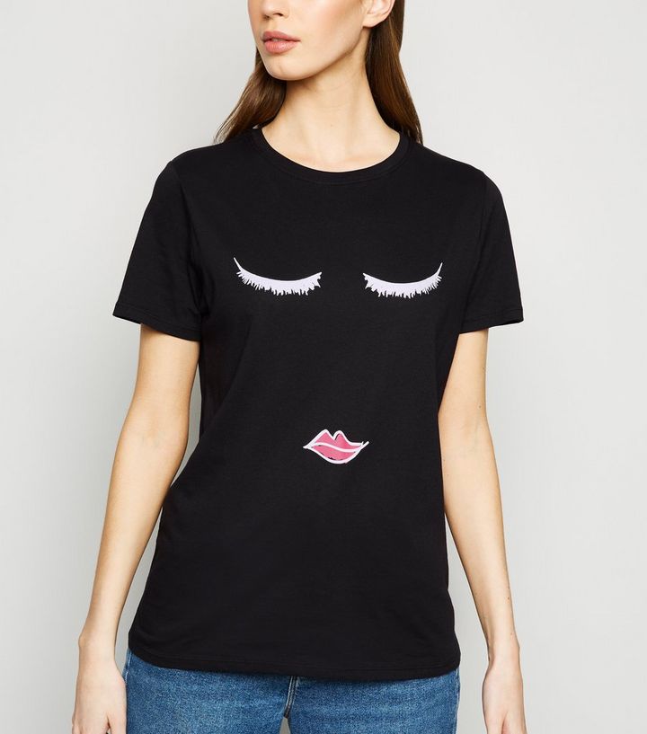 Schwarzes T Shirt Mit Wimpern Und Lippen Motiv In Glitzer Optik New Look