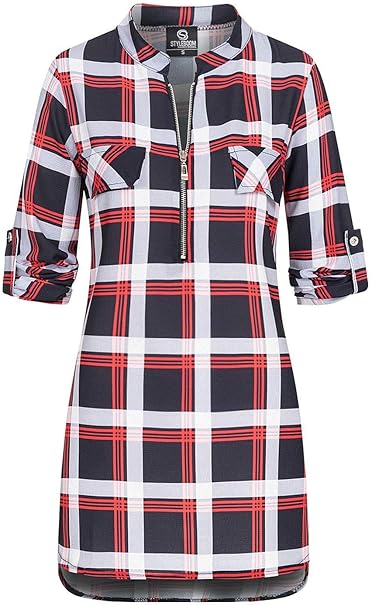 Styleboom Fashion Damen Turn Up Longform Bluse Karo Muster Navy Blau Rot Amazon De Bekleidung