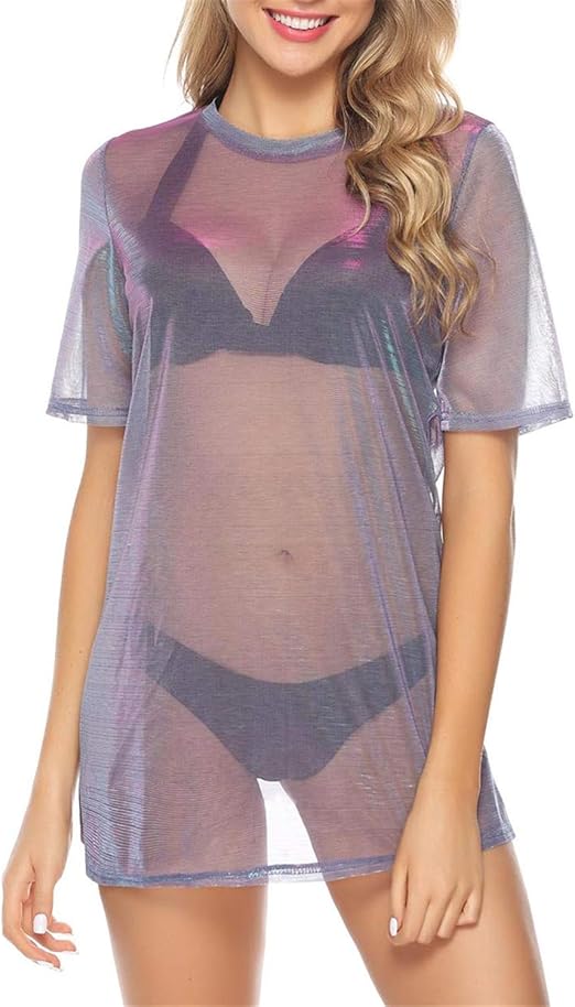 Hawiton Damen Transparent Netz Shirt Sexy Strandkleid Durchsichtiges Bikini Cover Up Sommertop Strandponcho Kurzarm Shirt Mesh Blusenkleid Party Oberteile Amazon De Bekleidung