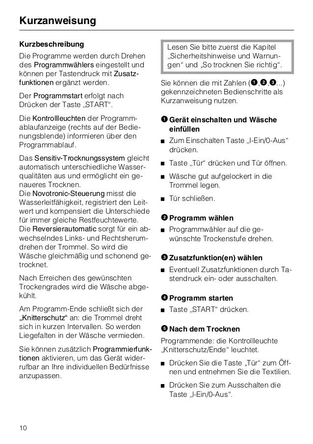 Anleitung Miele Trockner t 494 c Gewirkte Textilien (z B TShirts, Trikot wäsche) laufen bei der ersten Wäsche oft ein Deshalb diese Textilien nicht übertrocknen, um weiteres Schrumpfen zu vermeiden Kaufen Sie gewirkte Tex tilien eventuell eine oder zwei Num mern größer Programm ändern Nach Programmstart werden keine. Der Trockner muss lotrecht stehen, da * nachkaufbares Miele Zubehör Seite 25 Elektroanschluss Aufstellen und Anschließen Elektroanschluss Der Trockner ist mit einer Wechsel stromAnschlussleitung und Schu koStecker anschlussfertig für Wechsel strom ~ 230 V 50 Hz ausgerüstet. In dieser Rangliste finden Sie als Käufer unsere absolute TopAuswahl von Daunenjacke Trockner Programm Miele, wobei Platz 1 den oben genannten TOPFavorit darstellt Das Team hat im großen Daunenjacke Trockner Programm Miele Test uns jene relevantesten Artikel verglichen und die nötigen Merkmale zusammengefasst.