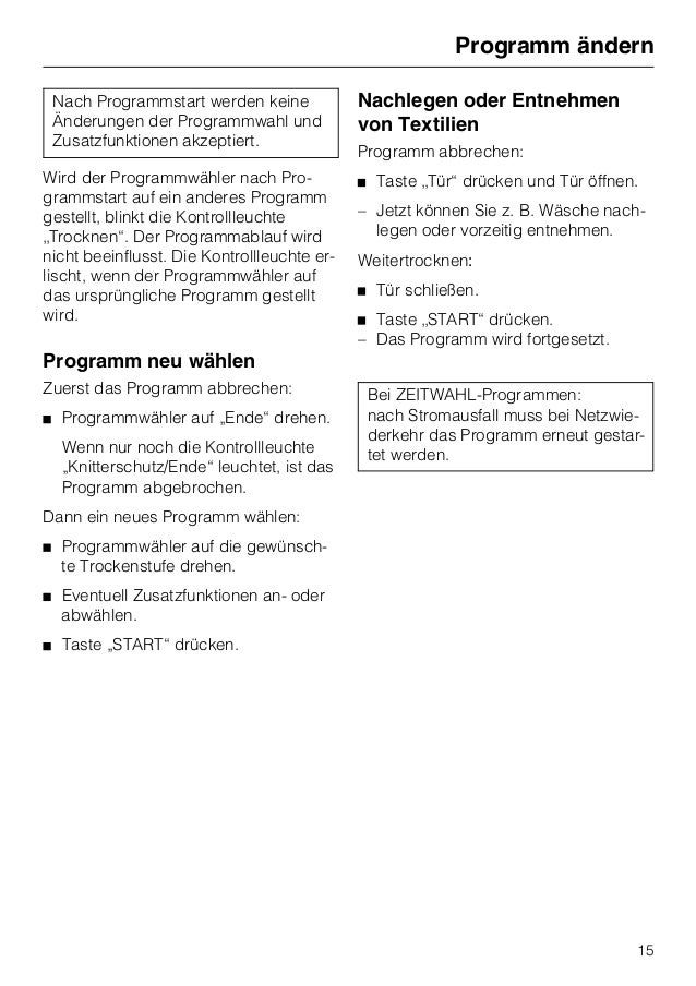 Programm wählen und starten 26 Programm wählen Durch die Programmwahl wird der Trockner eingeschaltet und über Pro grammwählerstellung ausgeschaltet Drehen Sie den Programmwähler Zusätzlich kann eine Trockenstufe leuchten und es werden Zeiten in der Zeitanzeige angezeigt. MIELE BLACK TSHIRT FULL WASH EXPRESS PROGRAM Part 2/3. OnlinePreise (ohne Versandkosten) ermittelt durch � Die Stiftung Warentest passt die Testmethoden regelmäßig an die technische Entwicklung an Aus diesem Grund sind nicht alle Testurteile vollständig miteinander vergleichbar.