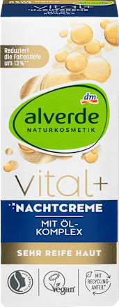 Die alverde Vital Nachtcreme ist besonders auf die Bedürfnisse von anspruchsvoller, trockener und reifer Haut ab 60 abgestimmt Die spezielle Formel spendet Feuchtigkeit und verleiht der Haut über Nacht mehr Spannkraft und neue Energie Inkanuss, Argan und MandelÖl pflegen intensiv und sorgen. Nachtcreme für sehr reife Haut 50 ml dmdrogerie markt Deutschland Test, Bewertung und Preisvergleich. In den Alverde Nachtcremes sind sie der Grund, warum die Haut so schön weich wird und viel Feuchtigkeit abgegeben wird Allerdings verwenden die Hersteller oft eine Bachblütenmischung, die wie folgt aussehen kann Hainbuche, Olive, Waldtrespe und Ulme oder Olive, Tausendgüldenkraut, Eiche und Hainbuche.