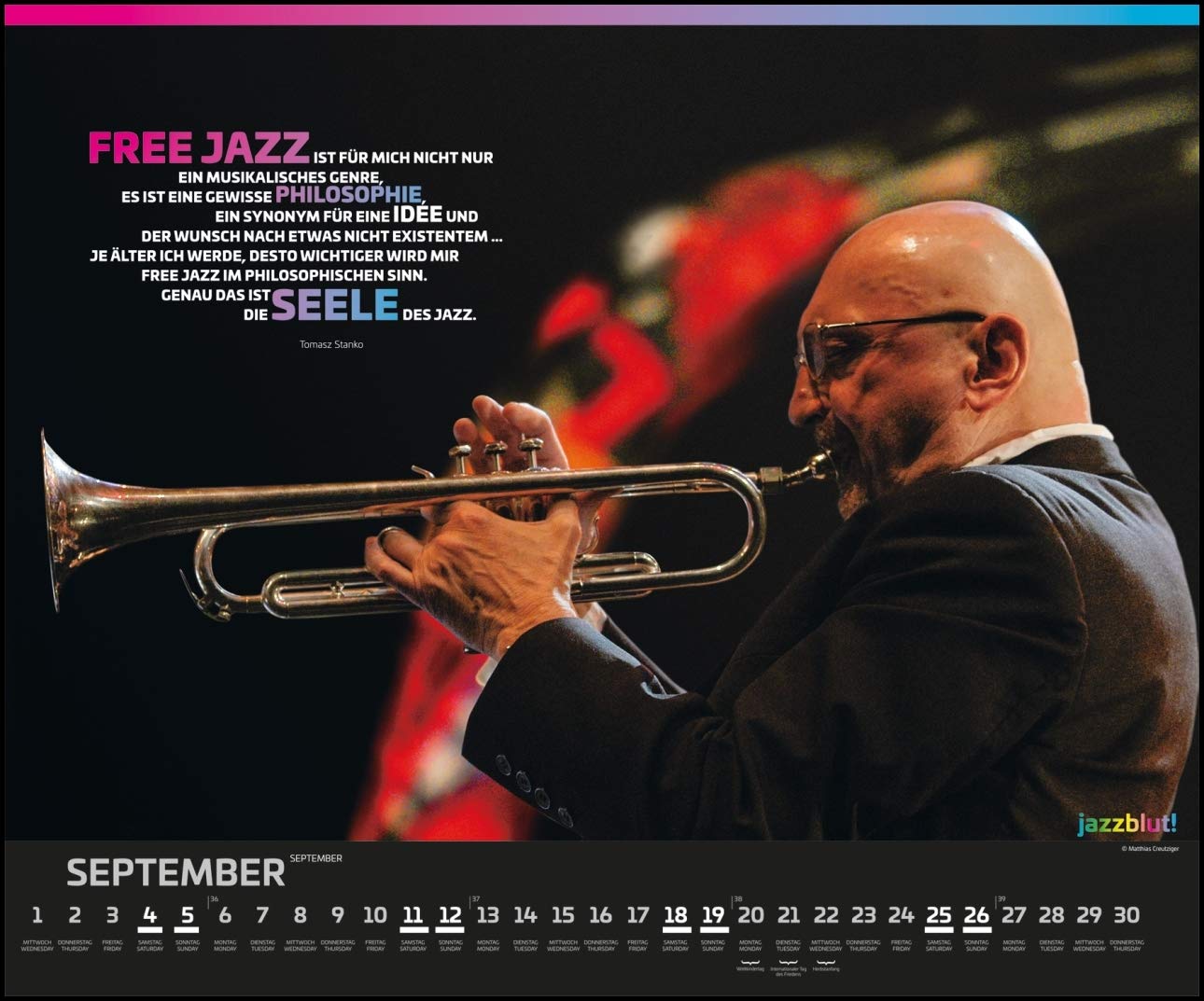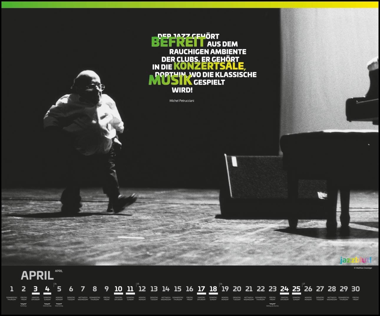 Jazzblut 21 – Berühmte JazzMusiker in Aktion – Mit Zitaten – Wandkalender 58,4 x 48,5 cm – Spiralbindung (Deutsch) Kalender – Wandkalender, Mai Mai von DUMONT Kalenderverlag (Herausgeber), Thomas Walther (Designer), Matthias Creutziger (Fotograf) & 0 mehr. Latin Jazz ist eine Fusion aus amerikanischem Jazz mit kubanischkaribischen Rhythmen, Stilen, Kompositionen und Instrumenten Ansatzweise wird auch brasilianischer Jazz dazu gezählt Während im Salsa Tanz und Gesang im Vordergrund stehen, sind es hier Improvisation und virtuose Soli. Bekannte Rapper wie Will Smith;.