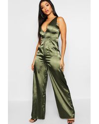 Boohoo Utility Cargo Jumpsuit Mit Weitem Bein Und Mit Reissverschluss In Satin Optik In Khaki Orange Lyst