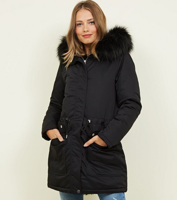 Schwarzer Parka Mit Fake Fur Besatz New Look