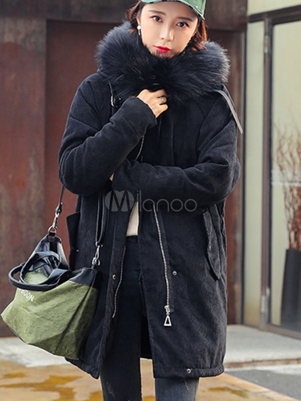 Black Parka Jacket Hooded Faux Fur Corduroy Coat Oversized Long Sleeve Winter Jacket For Women Milanoo Com