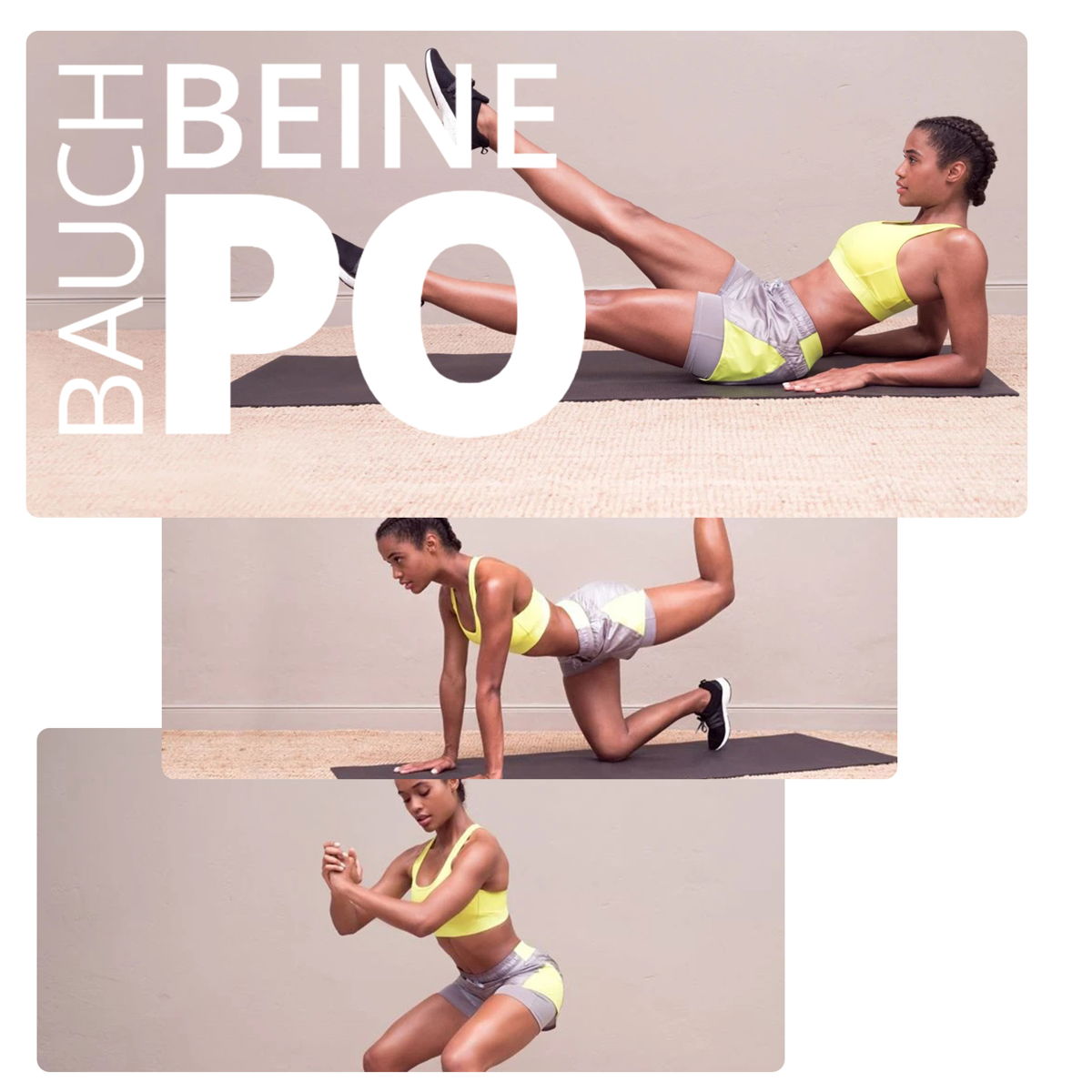 Vibrationsplatte Ein weiteres sehr effektives Gerät ist die Vibrationsplatte, eine ideale Ergänzung für jedes Homegym Denn man kann sie vielseitig benutzen Die Platte trainiert die Tiefenmuskulatur, also festigt und stärkt die Muskeln von Innen Ein minütiges Bauch, Beine, Po Workout, äußert sich bereits als sehr effektiv. Zielsetzung bei Bauch Beine Po Übungen Bevor du dich ans Training machst, solltest du dir überlegen, was du erreichen willst Es gibt nämlich verschiedene Arten von Bauch Beine Po ÜbungenEntweder möchtest du möglichst viel Muskelmasse aufbauen oder deine KraftAusdauerleistung verbessern wie etwa ein Läufer Zwischen beiden Ausrichtungen des Trainings gibt es Abstufungen und. Aber für unsere Bauch Beine Po Vibrationsplatten Übungen heute sind auch die Herren ganz herzlich eingeladen.