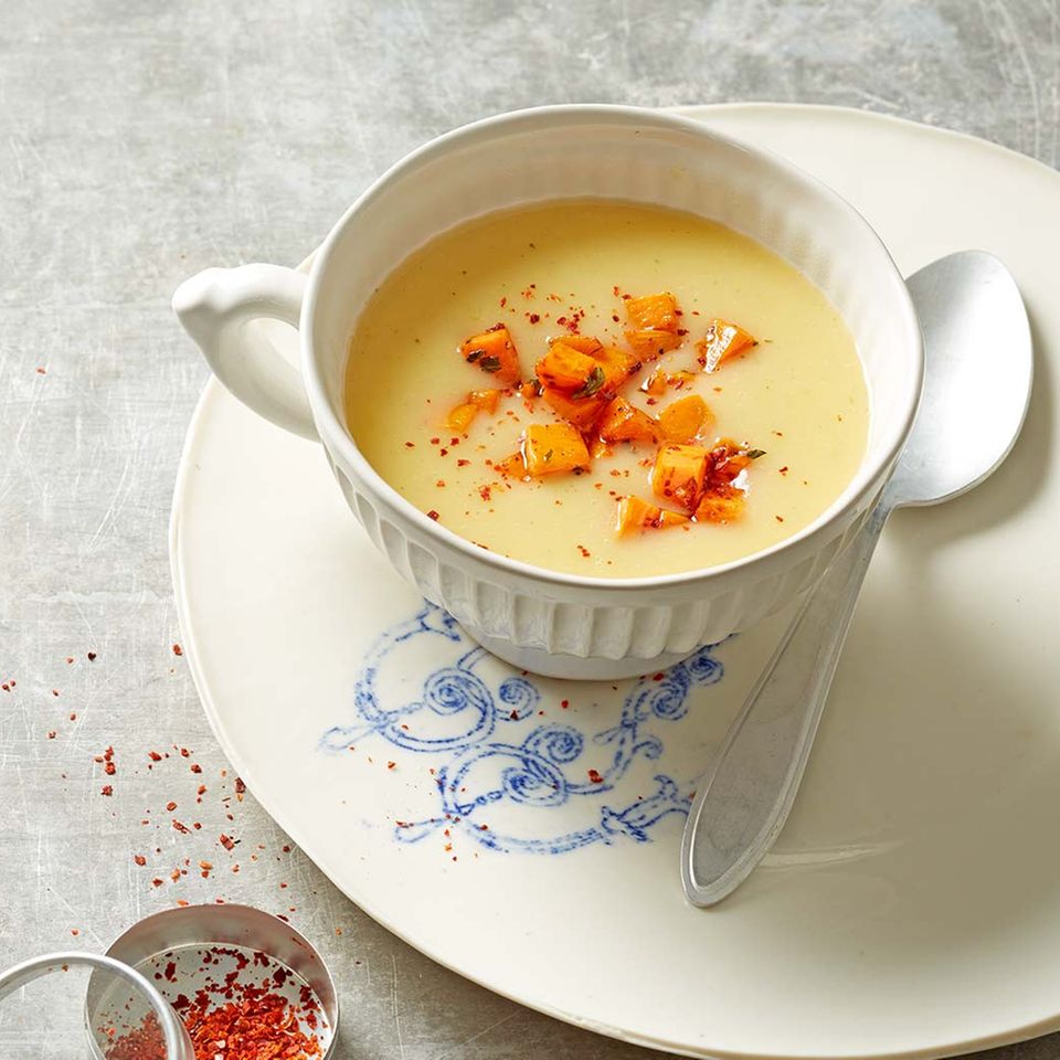 Susskartoffel Kurbis Suppe Mit Krautercroutons Cookidoo La Plataforma De Recetas Oficial De Thermomix