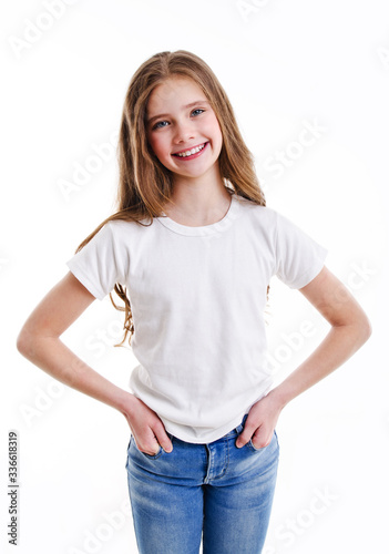Portrait Of Adorable Smiling Little Girl Child Preteen In Jeans And White T Shirt Isolated Wall Mural Svetamart