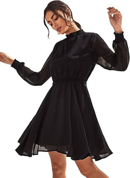 Didk Damen Kleider Langarm Chiffon Kleid Elastischer Hohe Taille Knielang Einfarbig Party Kleider Amazon De Bekleidung