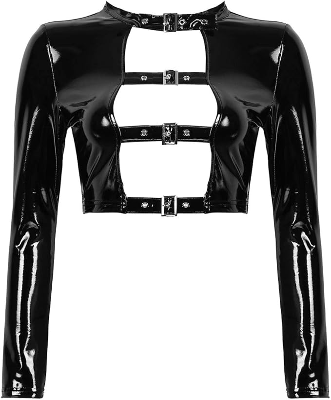Feeshow Frauen Wetlook Top Sexy Crop Top Langarmshirt Glitzer Oberteil Pullover Mit Vorne Aushohlung Gothic Punk Clubwear Partywear Schwarz M Amazon De Bekleidung