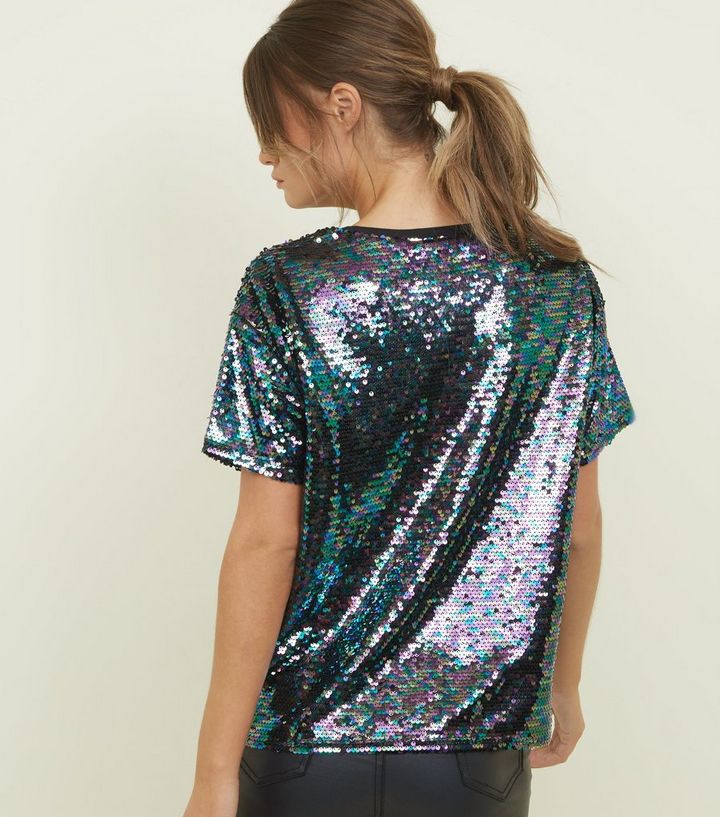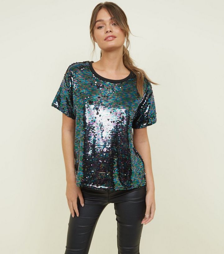 Schwarzes Oversize T Shirt In Schwarz Mit Schillernden Pailletten New Look