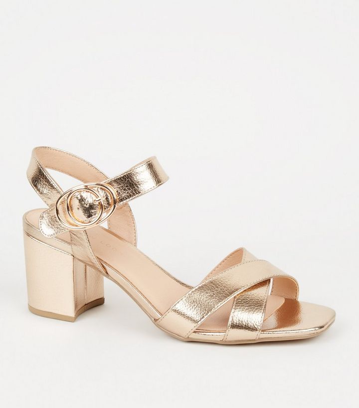 Wide Fit Rosegoldfarbene Sandaletten Mit Blockabsatz New Look
