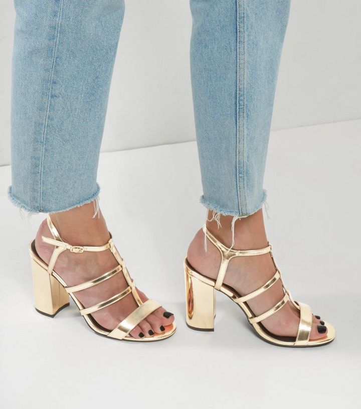 Metallic High Heels Mit Blockabsatz Und Strassriemen In Gold New Look