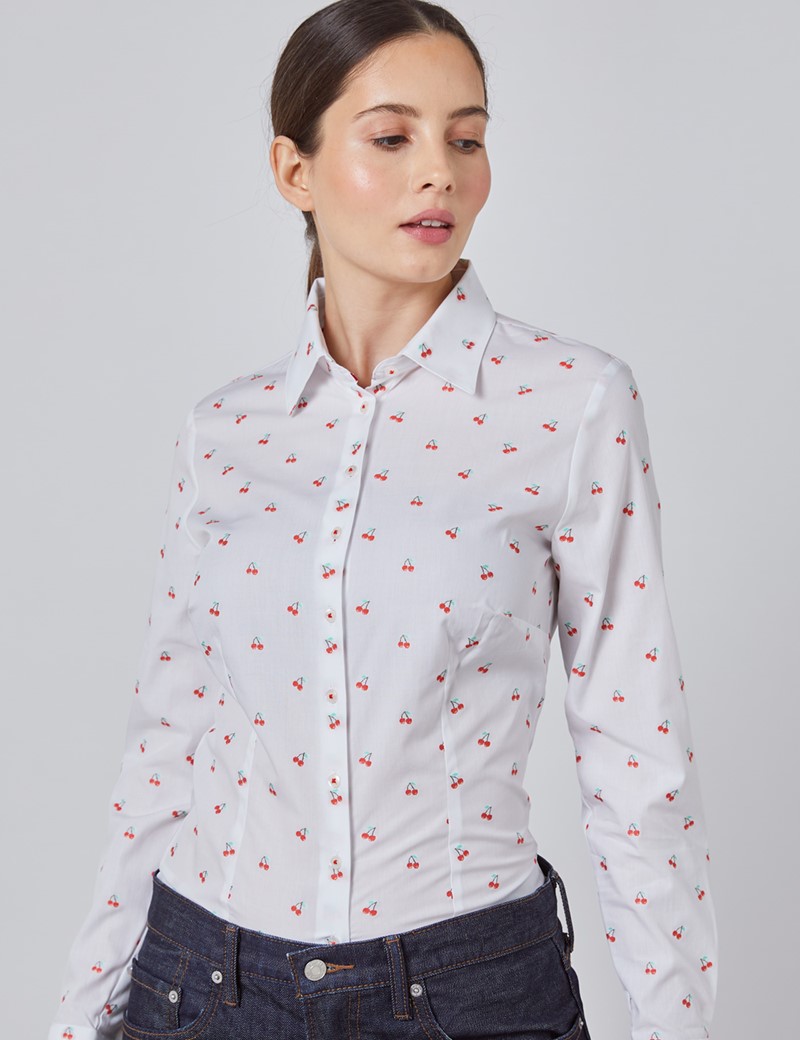 Bluse Slim Fit Baumwolle Weiss Mit Kirschen Stickerei Hawes Curtis