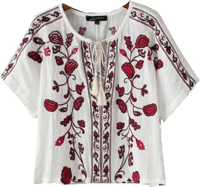 Weisse Patchwork Stickerei Rundhals Kurzarm Bohmische Bluse Blusen Oberteile