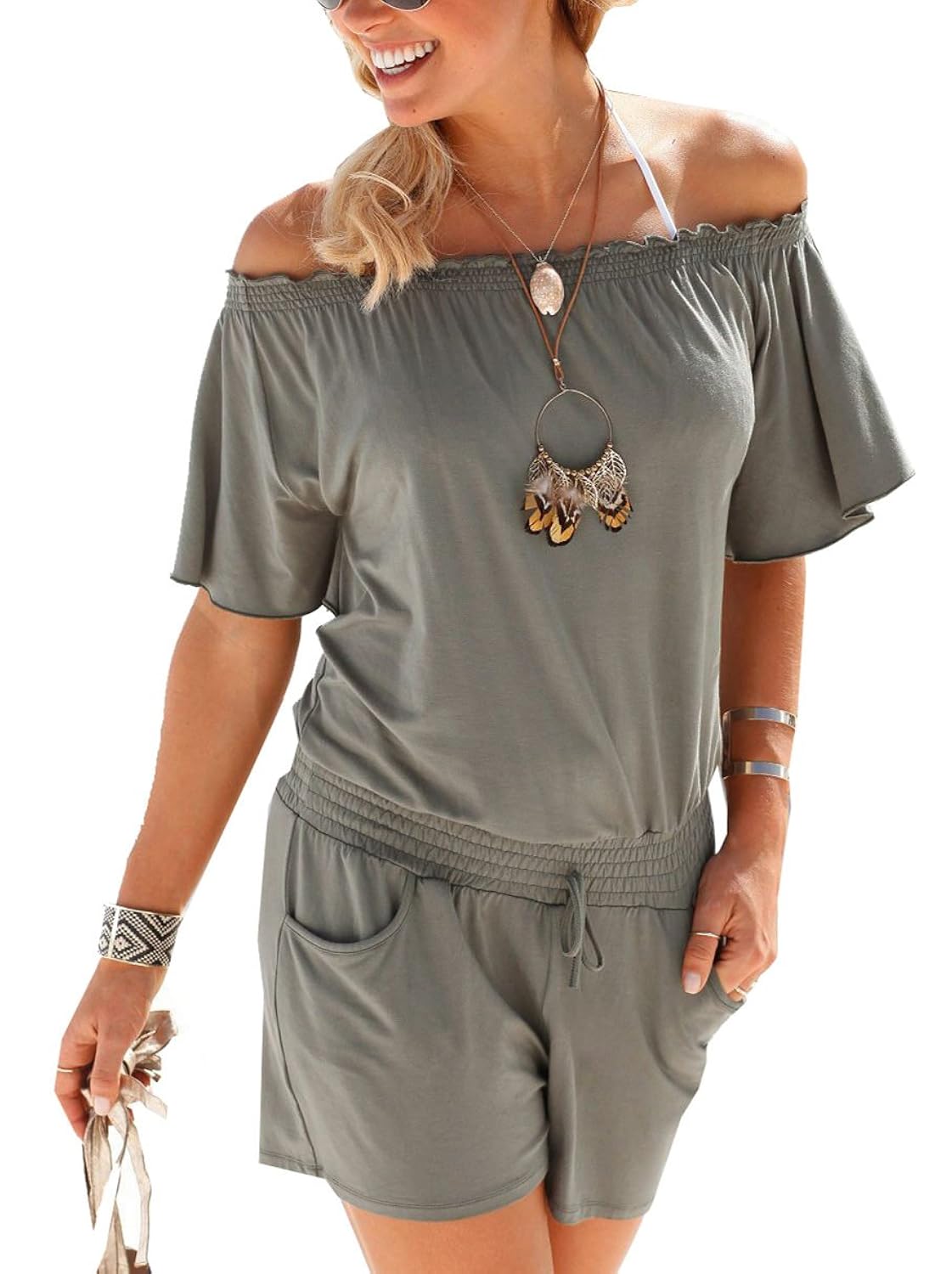Preiswerte Zoulouyou Jumpsuit Damen Sommer Kurz Off Shoulder Modische Bandeau Jumpsuit Overalls Sportlich Bequem Sommer Strand Elastisch Einfarbig Casual Mit Tasche Smaililaw Com