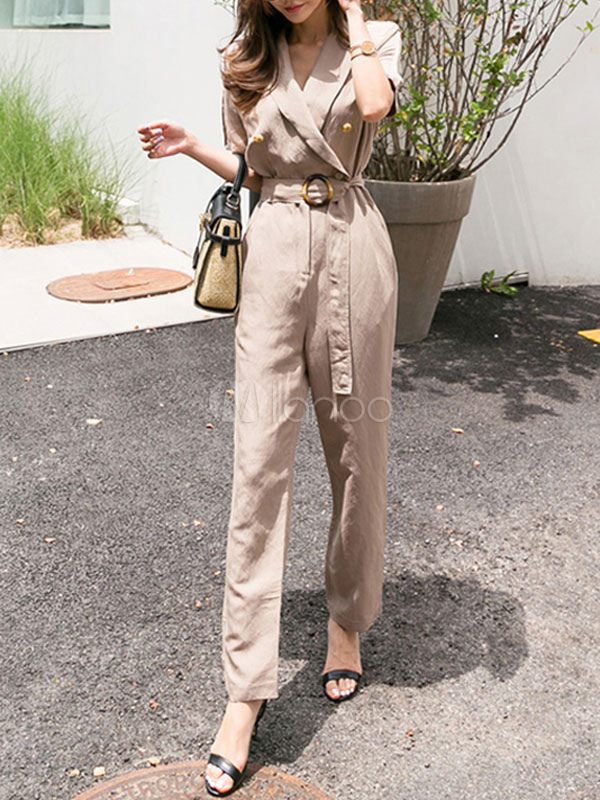 Jumpsuit For Women Apricot V Neck Short Sleeves Sash Brocade Straight Leg Summer Playsuit Milanoo Com