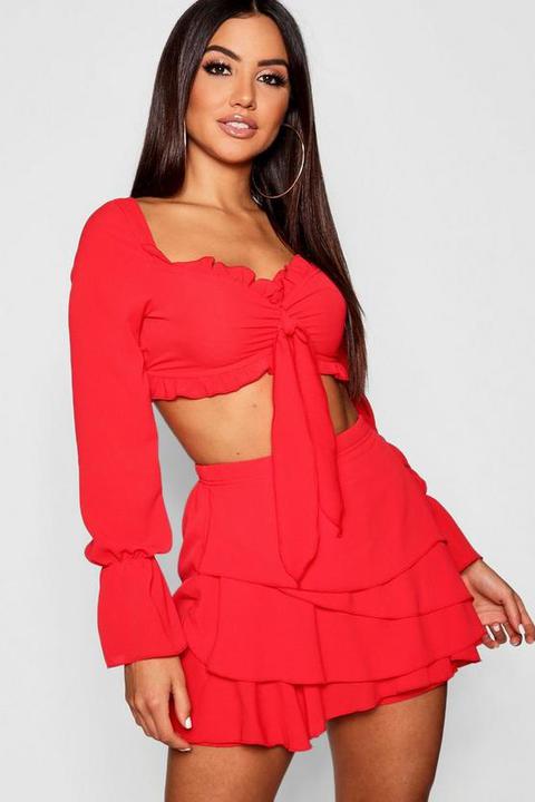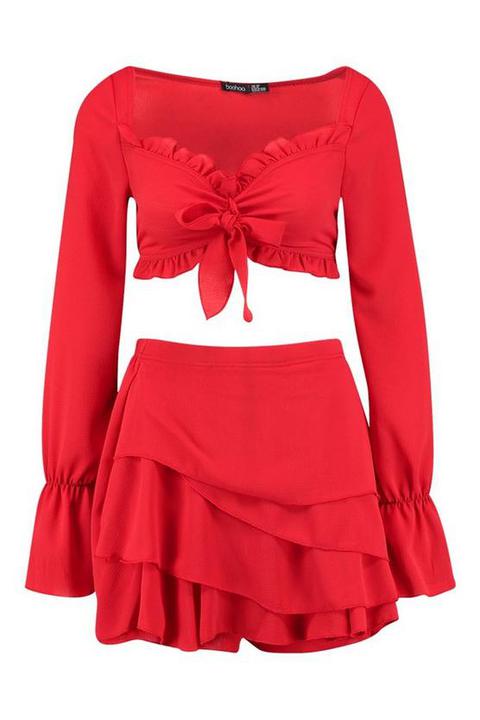 Womens Zweiteiler Aus Langarmeligem Top Mit Frontschurung Und Volant Shorts Rot 40 Rot From Boohoo On 21 Buttons