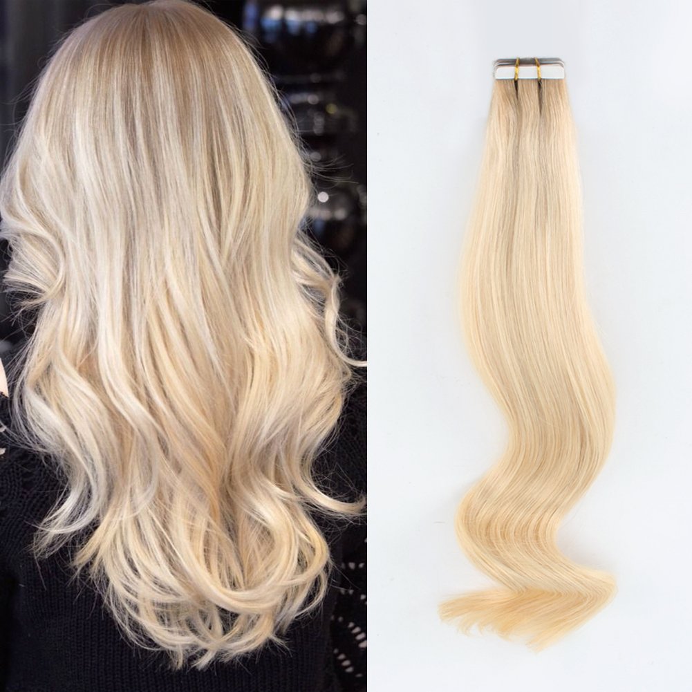 Amazon Com Abh Amazingbeauty Hair Rooted Tape In Hair Extensions Remy Human Hair Pieces 50 Grams Platinum Blonde With Dirty Blonde Roots Inch Beauty
