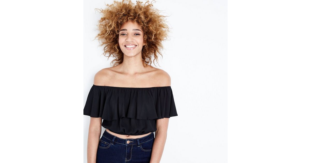 Kurz Geschnittenes Schulterfreies Oberteil Mit Ruschenbesatz In Schwarz New Look